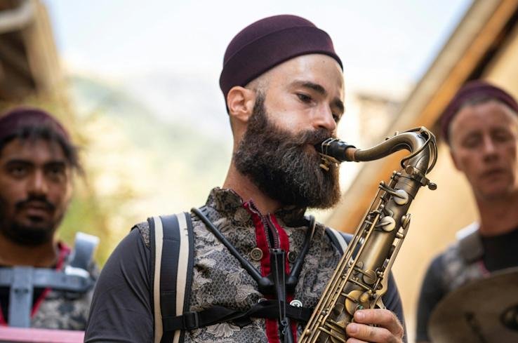Trío nómada de fanfarria (saxofón, teclado y batería).