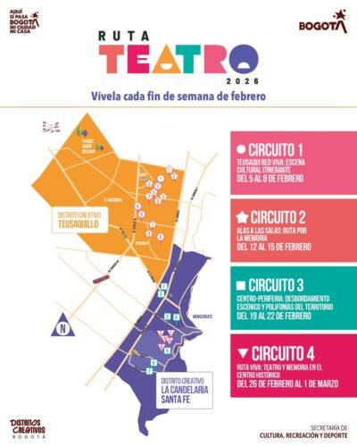 Desde el 5 de febrero, cada fin de semana se activarán cuatro circuitos teatrales en Distritos Creativos ofreciendo una programación cultural permanente. Para esta ocasión, el circuito Teusaqui Red Viva – Escena cultural itinerante tendrá lugar con sus distintos espacios de Artes Vivas.